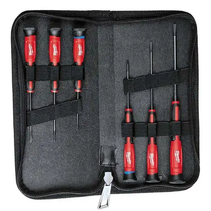 Milwaukee Precision är ett precisionsskruvmejselset innehållandes 6 stycken skruvmejslar med förkromade skaft som ökar verktygets livslängd genom att minska korrosion. Skruvmejslarna har fått ett förängt skaft för förbättrad sikt och utökad räckvidd. Levereras i ett hållbart fodral med robust blixtlås för säker lagring av verktygen.