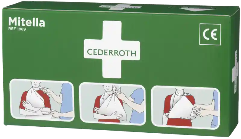 Cederroth Mitella knyts om halsen för stöd av en skadad arm. Kan också lindas runt huvudet för att hålla en kompress på plats vid huvudskada. Mitella kan också rullas ihop för att användas som tryckförband. Storlek 96 x 96 x 136 mm.