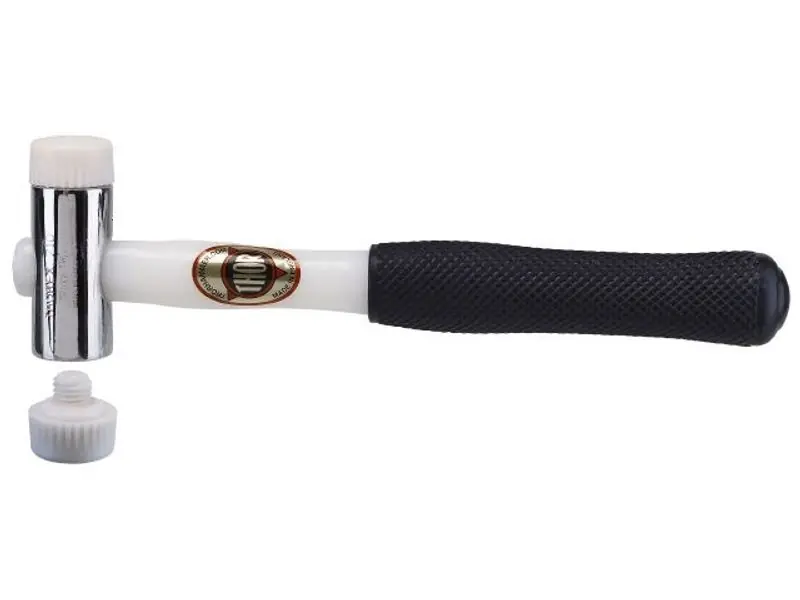 Thor Hammer Typ Thorex Nylon. Nylonhammare. Med utbytbara nylonslag. Vita. (Slagen har gängad tapp.) Slaghuvudet av stål. Nr 708N och 720N med hickoryskaft. Övriga med nylonskaft och gummihandtag.