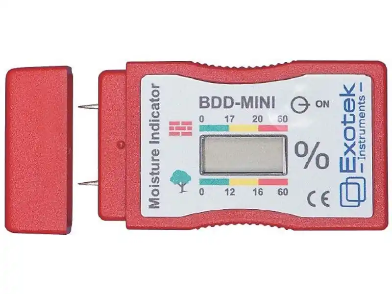 Exotek Instruments Fukt i trämaterial avläses på digital display, mätområde 6-60%. För övriga byggmaterial indikeras fuktnivån enligt grön-gul-röd skala. Instrumentet är litet till formatet och mycket enkelt att använda. Även lämpligt för kontroll av ved. Lämpligt bl.a. för byggnadsarbetare/inspektörer, fastighetsskötare, leverantörer av byggnadsmaterial, egnahems-ägare och målare. Drivs med 1 st batteri 12 V, typ 23 A samt bruksanvisning med riktvärden för trä och byggmaterial. Manual på svenska, engelska, ryska och finska.
