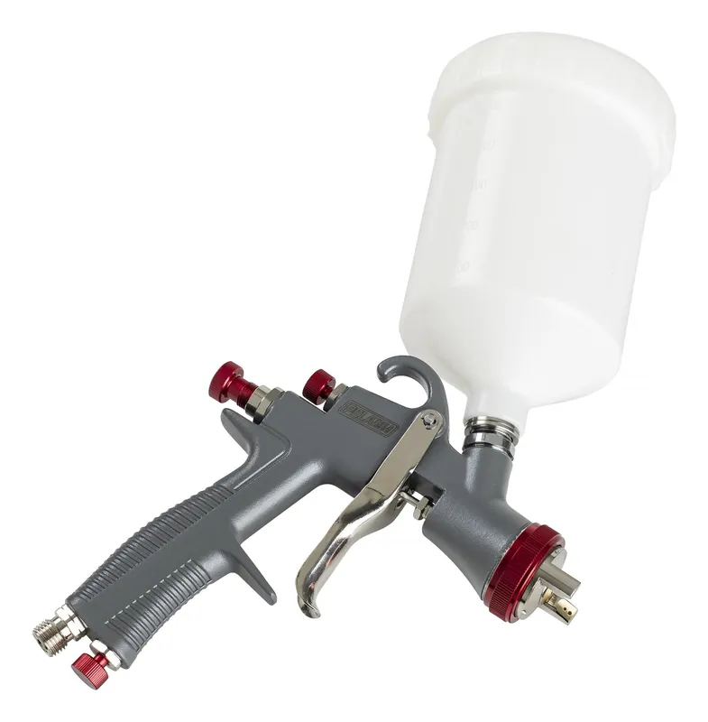 Pela 531933 är en HVLP färgspruta med överliggande kopp av plast, 600 ml. Levereras med 1,5 mm munstycke. 1/4″ anslutningsgänga.