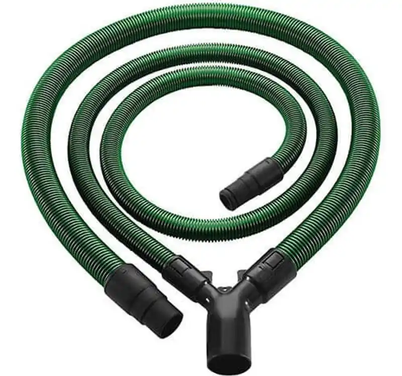 Om dammet sprutar ut på två ställen räcker det inte med en sugslang. På bordssågarna CS 50, CS 70 och bordssågen TKS 80 hjälper utsugssetet till att samla upp dammet där det uppstår: Både på skyddskåpan och på själva maskinen. Kombinationen av två slangar – diameter D 27 och D 36 – är perfekt anpassad till maskinerna och ansluter de båda dammande ställena till dammsugaren via Y-stycket. Med antistatfunktionen förhindras dessutom statisk uppladdning. På så sätt arbetar du hälsovänligt, dammfritt och bekvämt.
