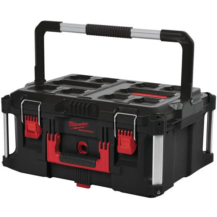 Milwaukee Packout Förvaringslåda på 560x410x290 mm. Är IP65 tillsluten för att hålla borta regn och arbetsdamm samt utrustad med metallförstärkta detaljer för lång hållbarhet.