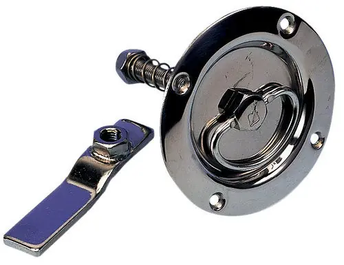 Kraftigt durkbeslag. Rostfritt elektropolerat AISI 316. Låsbart, fjäderbelastat med stopp. Justerbar 30 mm. Total höjd under plattan 78 mm. Regel 100 mm lång ingår.