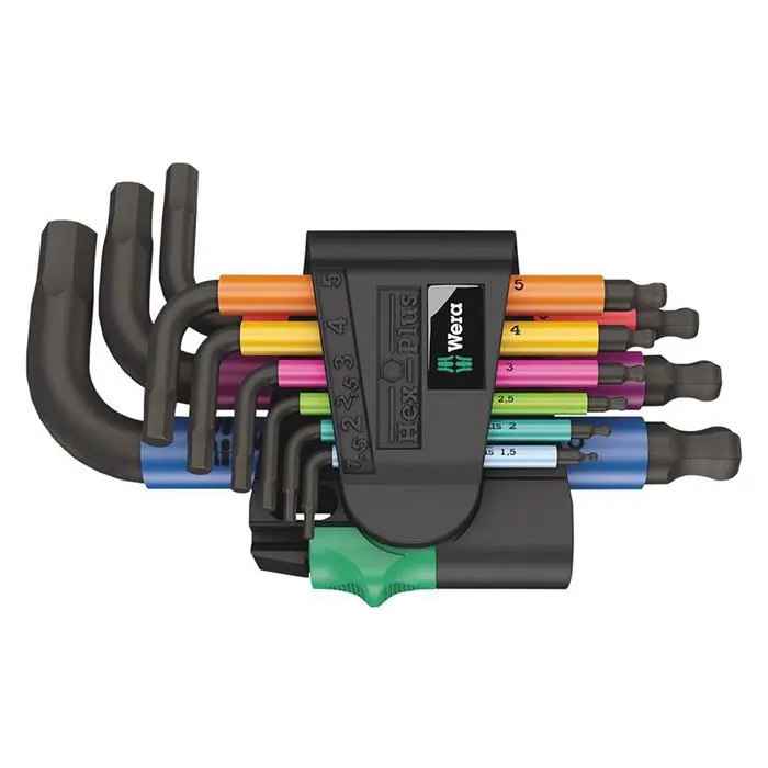 Wera 950/9 Hex-Plus Mulitcolour 2 är en vinkelskruvmejselsats i 9 delar. Verktygen är flerfärgade och har försetts med termoplasthylsa vilket gör de lätta att greppa. Det slitstarka klippmaterialet säkerställer säker lagring av verktygen och enkelt avlägsnande. Vinkelskruvmejslarna är framtagna för användning på sexkantiga uttagsskruvar.