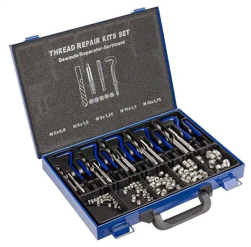 - Rostfria gänginsatser, 25 st av varje storlek: M5x0,8, M6x1,0, M8x1,25, M10x1,5 mm samt 10 st av varje storlek: M12x1,75 mm