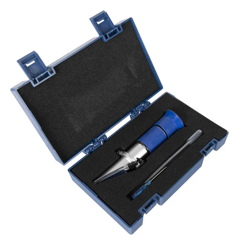 Dasqua batterisyra- och glykolprovare, eller refraktometer, är ett optiskt instrument som mäter densiteten/fryspunkten på bilkylmedel (propylenglykol och etylenglykol) från 0°C till -50°C med hjälp av brytningsindex. Placera några droppar på prismat, stäng locket och läs sedan av värdet. Krävs bara ett par två eller tre droppar för snabb och exakt avläsning. Indikerar också vikten av batterisyra och ger en snabb referens till batteriets laddningstillstånd. Levereras komplett med förvaringsväska, skruvmejsel och pipett.