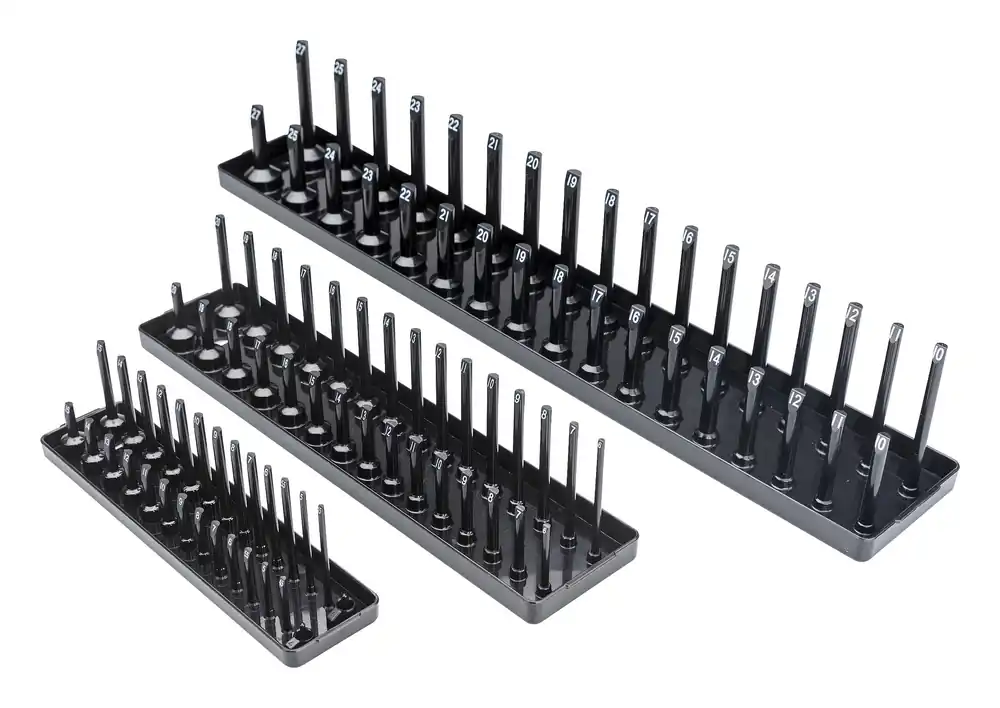 Pela 510254 är en hylshållare av plast som är avsedd för 1/4″-, 3/8″- & 1/2″-hylsor. Säljs i förpackning om 3 stycken, en för vardera hylsstorlek. Hållaren för 1/4″-hylsor har en storlek på 225 x 55 x 65 mm, hållaren för 3/8″-hylsor har en storlek på 335 x 75 x 75 mm och hållaren för 1/2″-hylsor har en storlek på 515 x 90 x 90 mm.