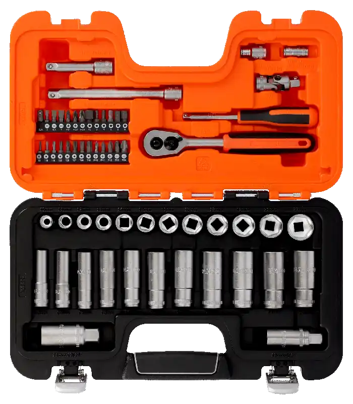 - 12 stycken 3/8" sexkantshylsor: 10, 11, 12, 13, 14, 15, 16, 17, 18, 19, 20 och 22 mm br/>11 stycken 3/8" långa sexkantshylsor: 10, 11, 12, 13, 14, 15, 17, 18, 19, 20 och 22 mm br/>1 styck 3/8" spärrhandtag med snabblossning, 60 tänder och 6° omtagsvinkel br/>2 stycken 3/8" förlängare, 75 mm (3") och 150 mm (6") br/>1 styck 3/8" universalknut br/>1 styck bitshållare 3/8" x 1/4" br/>2 stycken 3/8" sexkantshylsor för tändstift: 16 mm (5/8") och 21 mm (13/16") br/>1 styck 1/4" vridhandtag med tvåkomponentshandtag br/>1 styck bitshållare 1/4" x 1/4" br/>3 stycken 1/4" bits för spårskruv: 4, 5,5 och 7 mm br/>3 stycken 1/4" bits för Phillips®-skruv, PH1, PH2 och PH3 br/>2 stycken 1/4" bits för Pozidriv-skruv: PZ1 och PZ2 br/>7 stycken 1/4 bits för insexskruv: 2,5, 3, 4, 5, 6, 7 och 8 mm br/>6 stycken 1/4" bits för Torx®-skruv: T10, T15, T20, T25, T30 och T40