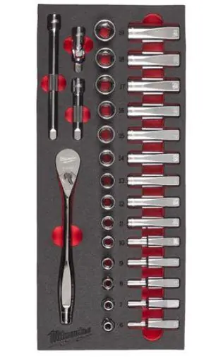 3/8″ hylsnyckelsats i 32 delar som innehåller standardhylsor och långa hylsor i storlekarna 6-19 mm. Satsen innehåller även ett 90-tänders spärrhuvud med 4° vinkel för trånga arbetsutrymmen samt två förlängare. FOUR FLAT på sidorna av hylsan förhindrar rullning. Helt i metall för maximal hållbarhet.