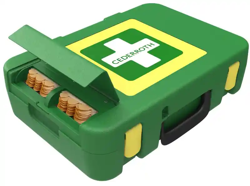 Detta Första Hjälpen-kit är skapat för att erbjuda omedelbar hjälp vid akuta situationer. Förvarad i en robust hårdplastväska, är kitet utrustat med en praktisk plåsterautomat och skyddar innehållet mot stötar, damm och fukt. Den genomtänkta layouten erbjuder en tydlig översikt av de viktiga artiklarna såsom handskar, sax, andningsmask och mycket mer. Röda refillappar signalerar när det är dags att fylla på, och signalfärgerna i grönt och gult gör väskan synlig även på långt håll. Dessutom finns plats för ögondusch eller andra tillval.