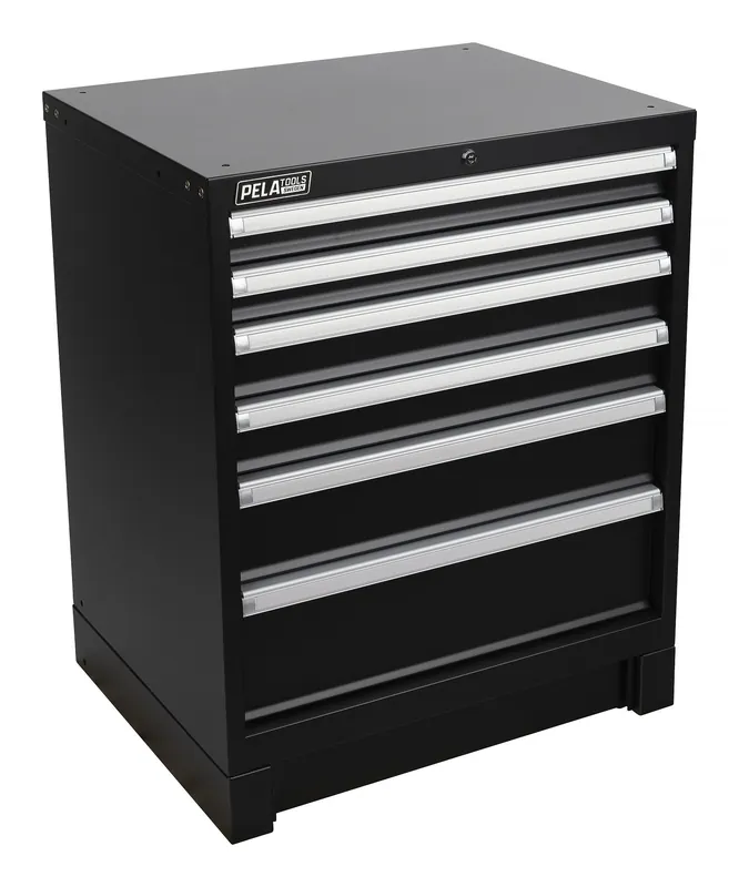 PELA 537741 är en stabil hurts med svartlackerat utförande och silvriga detaljer som matchar den svarta verkstadsinredningen Profi 509665 från PELA och alla dess utföranden. Denna garage- och verkstadshurst har 6 stycken utdragbara lådor, varav 5 stycken som klarar en belastning på 75 kg per låda och en som klarar hela 200 kg. Hurstens tippskydd tillåter endast en låda att vara öppen i taget och alla lådor har låsspärr i handtaget vilket förhindrar lådorna från att öppnas oönskat.