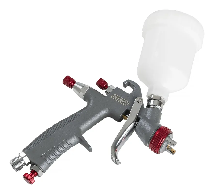 Pela 531934 är en HVLP färgspruta med överliggande kopp av plast, 125 ml. Levereras med 0,8 mm munstycke. 1/4″ anslutningsgänga.