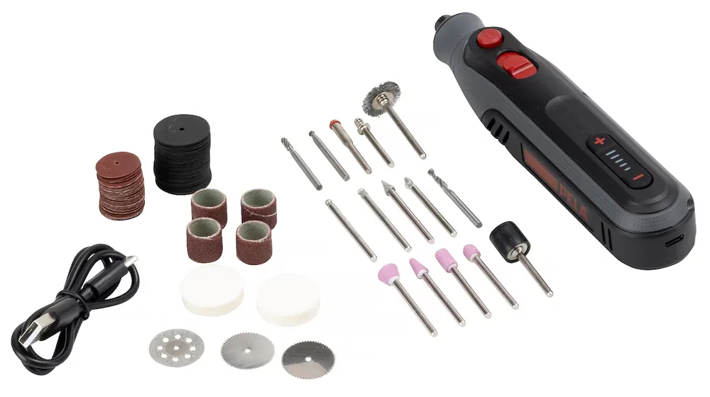 PELA 544361 är ett uppladdningsbart multiverktyg som är ett smidigt verktyg för dina projekt. Med en laddningstid på endast 2–3 timmar och en batterikapacitet på 2000mAh Li-ion är den designad för långvarig användning. Multiverktyget har en nominell spänning på 4 V DC och 5 hastighetsinställningar som sträcker sig från 5 000 till 25 000 rpm. Multiverktyget har en praktisk hastighetsindikator så att du alltid har full kontroll över ditt arbete. Du kan använda multiverktyget för en mängd olika arbetsuppgifter så som att kapa, såga, slipa, polera, gravera, skärpa, rengöra eller fräsa i en mängd olika material. Dess verktygslösa snabb chuck och en 3,2 mm spännhylsa gör det enkelt att byta mellan olika tillbehör. Multiverktyget är kompatibelt med de flesta vanliga tillbehör på marknaden.
