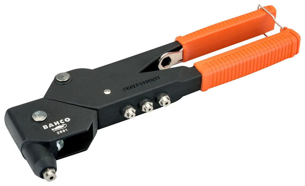 Handhållet nitverktyg med vridbart huvud i 360°. Används till metall, läder, kanvas och vinyl etc. För nitar på 2,4, 3,2, 4,0 samt 4,8 mm. Fyra medföljande munstycken varav tre kan förvaras i handtaget när de inte används. Nyckel för utbyte av munstycken medföljer.