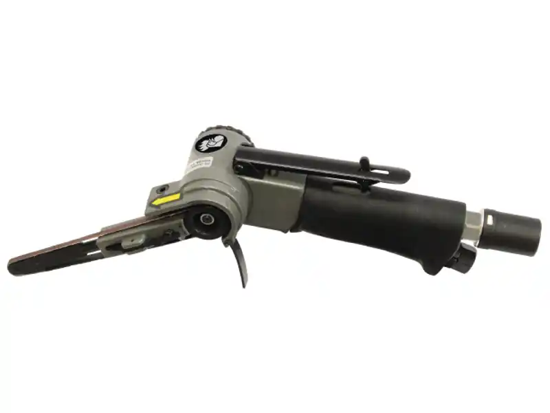 Red Rooster tryckluftsdriven bandslipmaskin som är lämplig för slipning på svåråtkomliga ställen på såväl stål, aluminium, plast och trä. Handtaget är svängbart 360° i förhållande till sliparmen. Med säkerhetspådrag. Bakåtriktad, ljuddämpad luftströmning.