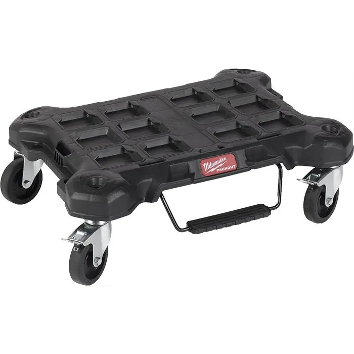 Milwaukee 4932471068 Packout är en hjulbas med en viktkapacitet på 113 kg och slitstarka hjul som enkelt rullar med tung last på arbetsplatsen. Utrustad med en låsbroms och två sidolås som hjälper till att stoppa vagnen för anslutning av PACKOUT™-lådor och väskor. Hjulbasen har måtten 610 x 480 x 190 mm (L x B x H).