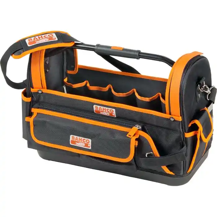 Praktisk verktygsväska i öppen design med inner- och ytterfack, ergonomiskt handtag och axelband. Mått: 470x230x355 mm.