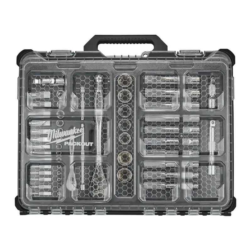90 spärrtänder ger 4° bågspänning för bättre åtkomst i trånga utrymmen. Hylsorna är stämplade med mått på den platta sidan för lättavläst synlighet. FOUR FLAT™ på sidorna av hylsan förhindrar rullning. Levereras i en PACKOUT™ Slim sortimentsbox 4932471064. PACKOUT SLIM ORGANISER, 1/2″ Standardhylsor: 10 mm, 11 mm, 12 mm, 13 mm, 14 mm, 15 mm, 16 mm, 17 mm, 18 mm, 19 mm, 20 mm, 21 mm, 22 mm, 23 mm, 24 mm, 25 mm, 26 mm / långa hylsor: 10 mm, 11 mm, 12 mm, 13 mm, 14 mm, 15 mm, 16 mm, 17 mm, 18 mm, 19 mm / 1/2″ Drive 76 mm förlängare, 127 mm förlängare, 1/2 Universalfäte; 1/4″ Standardhylsor: 4mm, 4.5mm, 5 mm, 5.5 mm, 6 mm, 7 mm, 8 mm, 9 mm, 10 mm, 11 mm, 12 mm, 13 mm, 14 mm, 15 mm / långa hylsor: 4 mm, 4.5 mm, 5 mm, 5.5 mm, 6 mm, 7 mm, 8 mm, 9 mm, 10 mm, 11 mm, 12 mm, 13 mm, 14 mm, 15 mm / 1/4″ Drive 76 mm förlängare, 152 mm förlängare, 1/4″ Universalfäste.