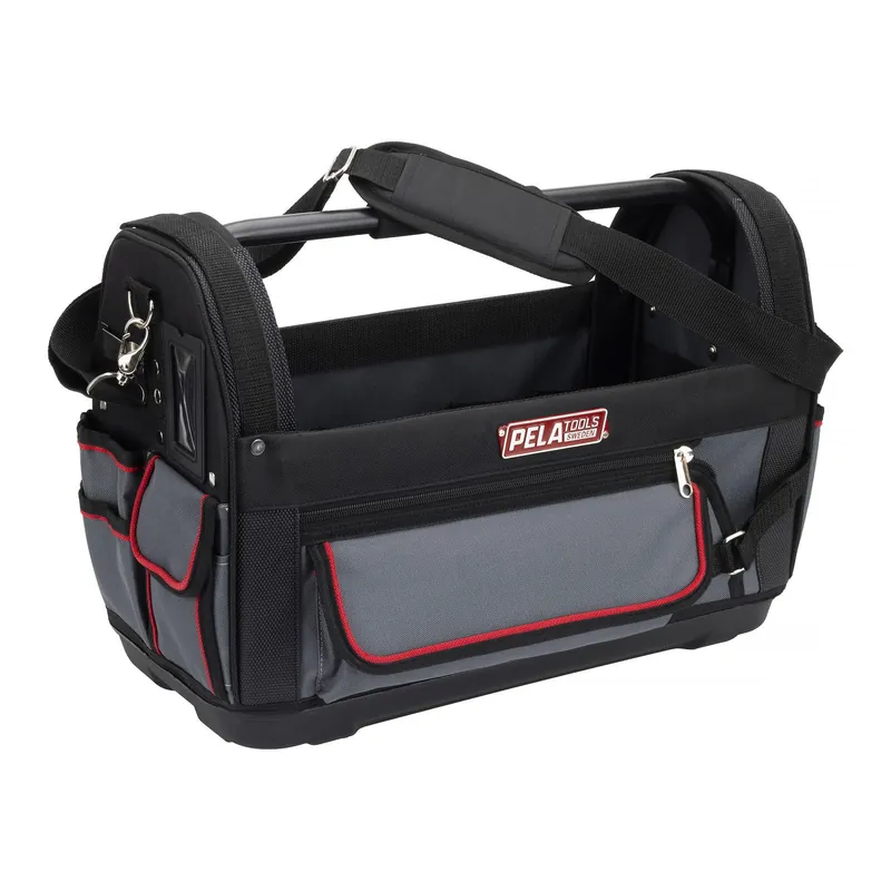 Pela 543529 är en verktygsväska för snickare och hantverkare. Öppen design för enkel åtkomst av verktyg. Tillverkad av slitstarkt tyg för att tåla tuffa tag samt botten av plast som skyddar verktyg och maskiner mot väta.