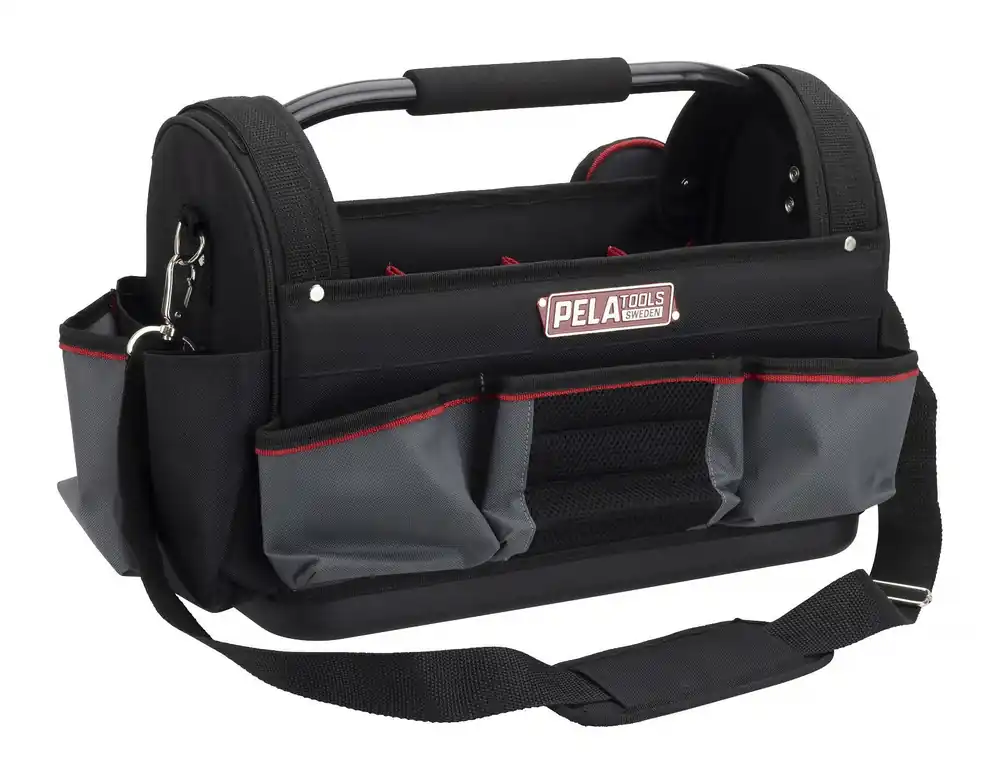 Pela 543530 är en verktygsväska för snickare och hantverkare. Öppen design för enkel åtkomst av verktyg. Tillverkad av slitstarkt tyg för att tåla tuffa tag samt botten av plast som skyddar verktyg och maskiner mot väta.